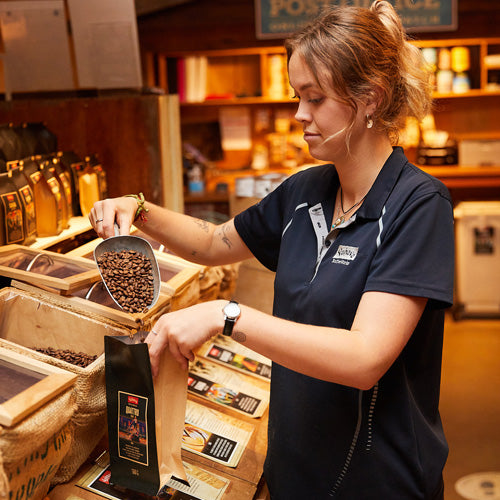 Here will you find some of the world’s most delicious coffees, all under one roof. If the collection seems bewildering then we will make the task of finding the perfect coffee for you a little easier. The coffees in the shed are categorised with the mellower roasts at one end and run to the bolder coffees at the other. Our ‘house coffees’ are all roasted regularly and are the result of years of roasting and refining. Our customers keep coming back for time and time again for these great coffees. If you see a coffee that looks like it could be what you are after, remember the name and front up at the Tasting Bench for a sample. You might like to sample our Specialty Estate coffees. We also roast ‘Limited Edition’ coffees, like STORM, FIRSTLIGHT & Grand Cru.
